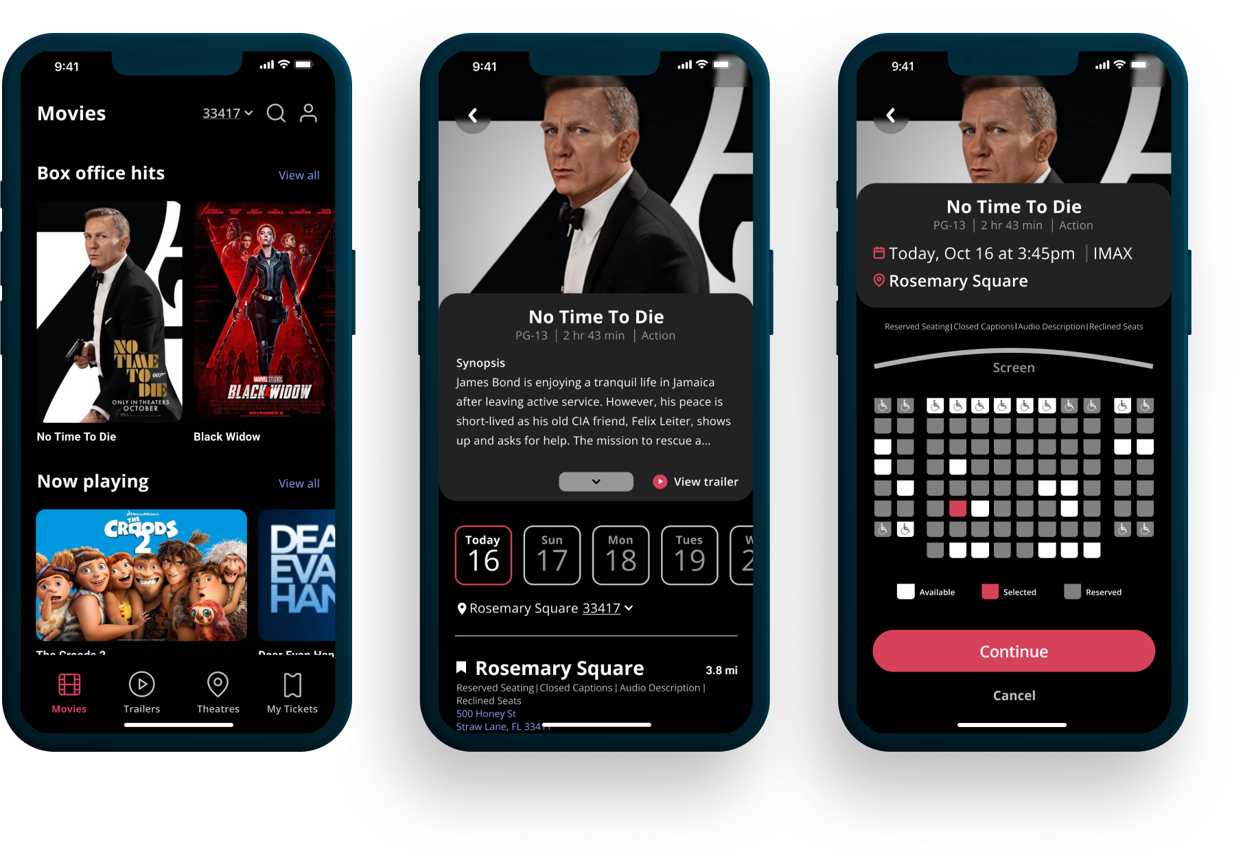 Based on user pain points and testing feedback, I designed an intuitive booking flow where users can select seats directly from the interactive theater layout with a higher contrast combination of colors. This feature addresses the common frustration of blind seat selection and enhances the user’s confidence in their choices. The result brought forth a smoother, more enjoyable booking experience.