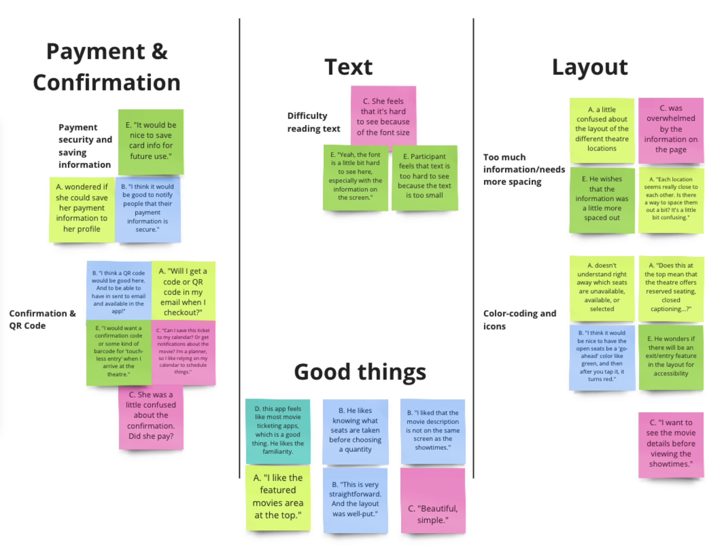 After testing, in order to synthesize my findings, I used Google Sheets to take observational notes and quotes. Next, I used Miro to begin affinity mapping to organize and understand where my low-fidelity designs failed or succeeded. Based on those findings, I was able to find themes and insights related to how users performed each task.