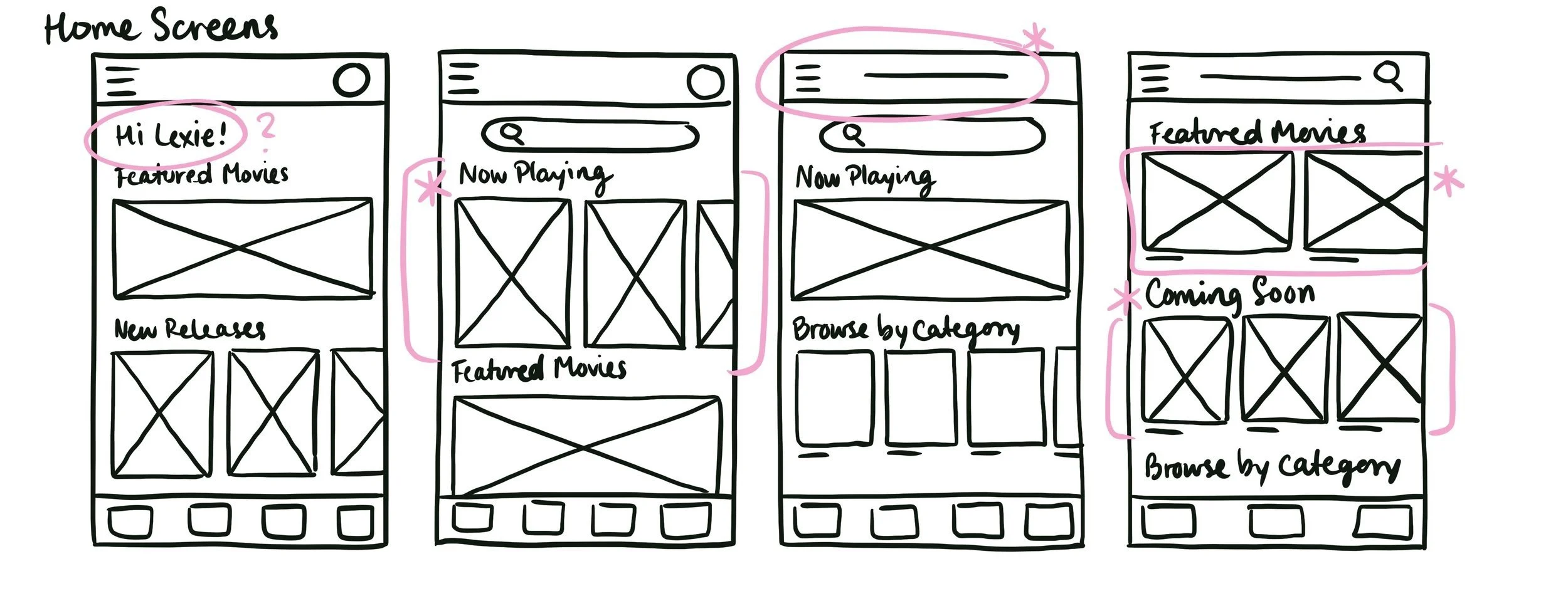 During this stage, I had the challenge of figuring out the best way to lay out the home page so that users can navigate easily. First, I rapidly sketched a few layout options that would best suit the content of the app and who it is being designed for. This portion of the ideation process was very important because it saved me time by sketching some ideas down instead of skipping the sketches and then feeling stuck during wireframing.